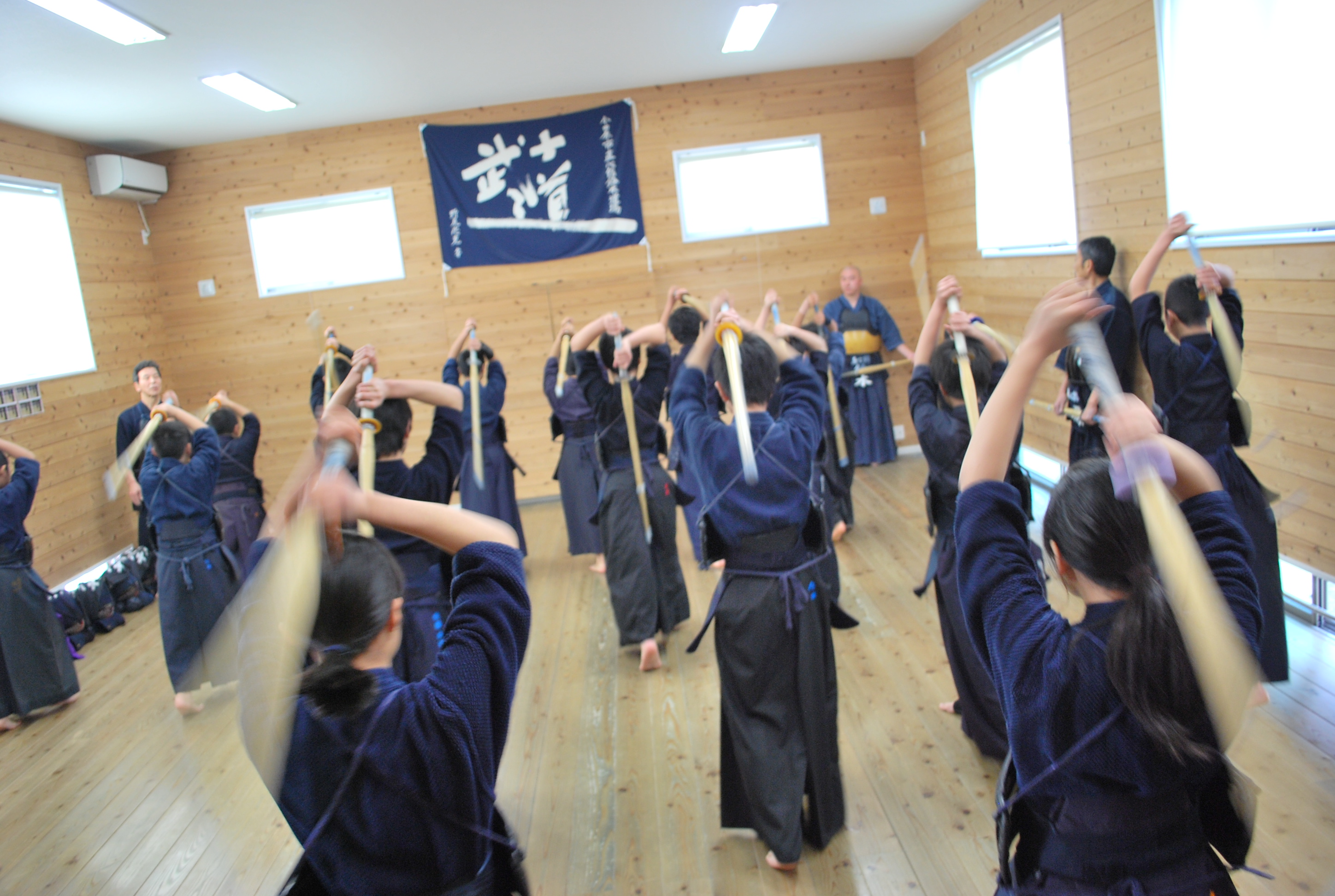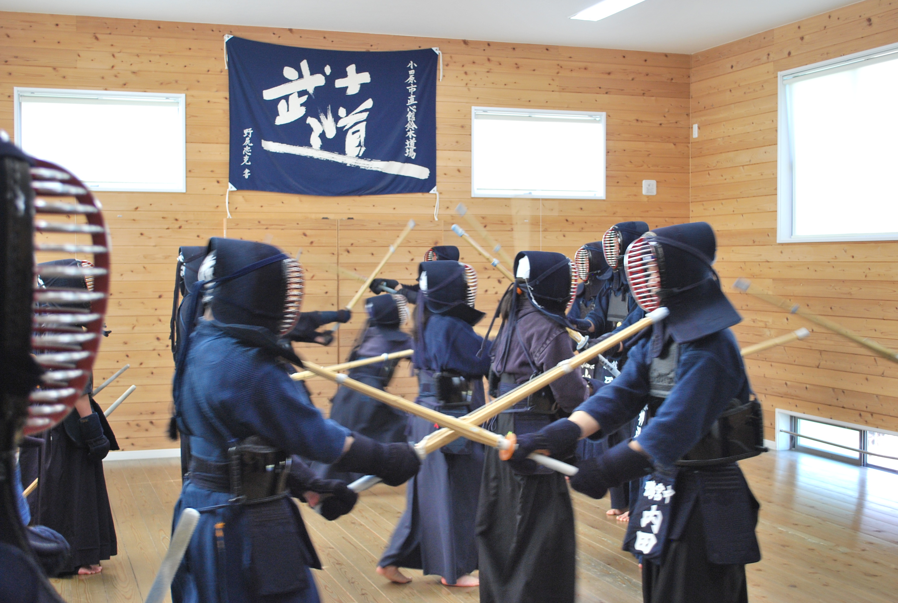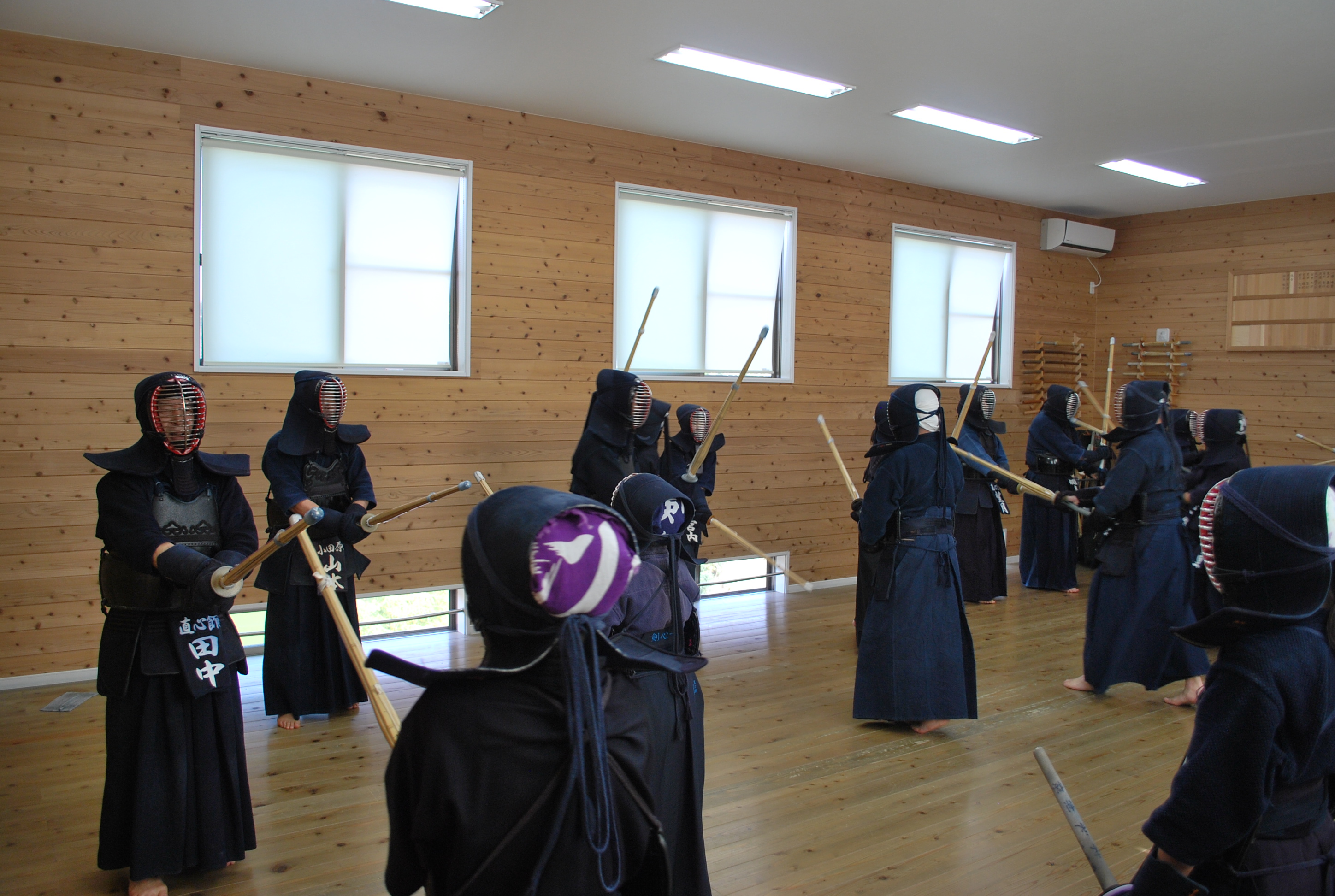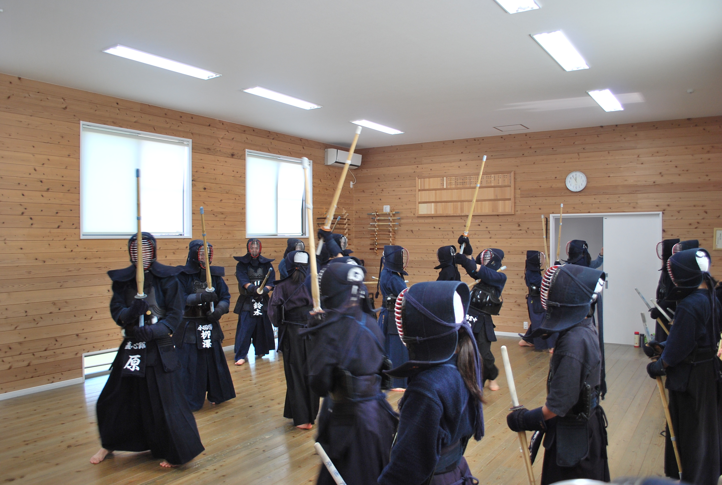本日は、横須賀から剣琉塾坂本道場の皆さん、市内からは城南中学校・鴨宮中学校の皆さんが出稽古に来てくださいました。直心館は試合会場1コートの広さもない小さな道場ですが、実に34人という大人数で気合のこもった稽古をすることができました。