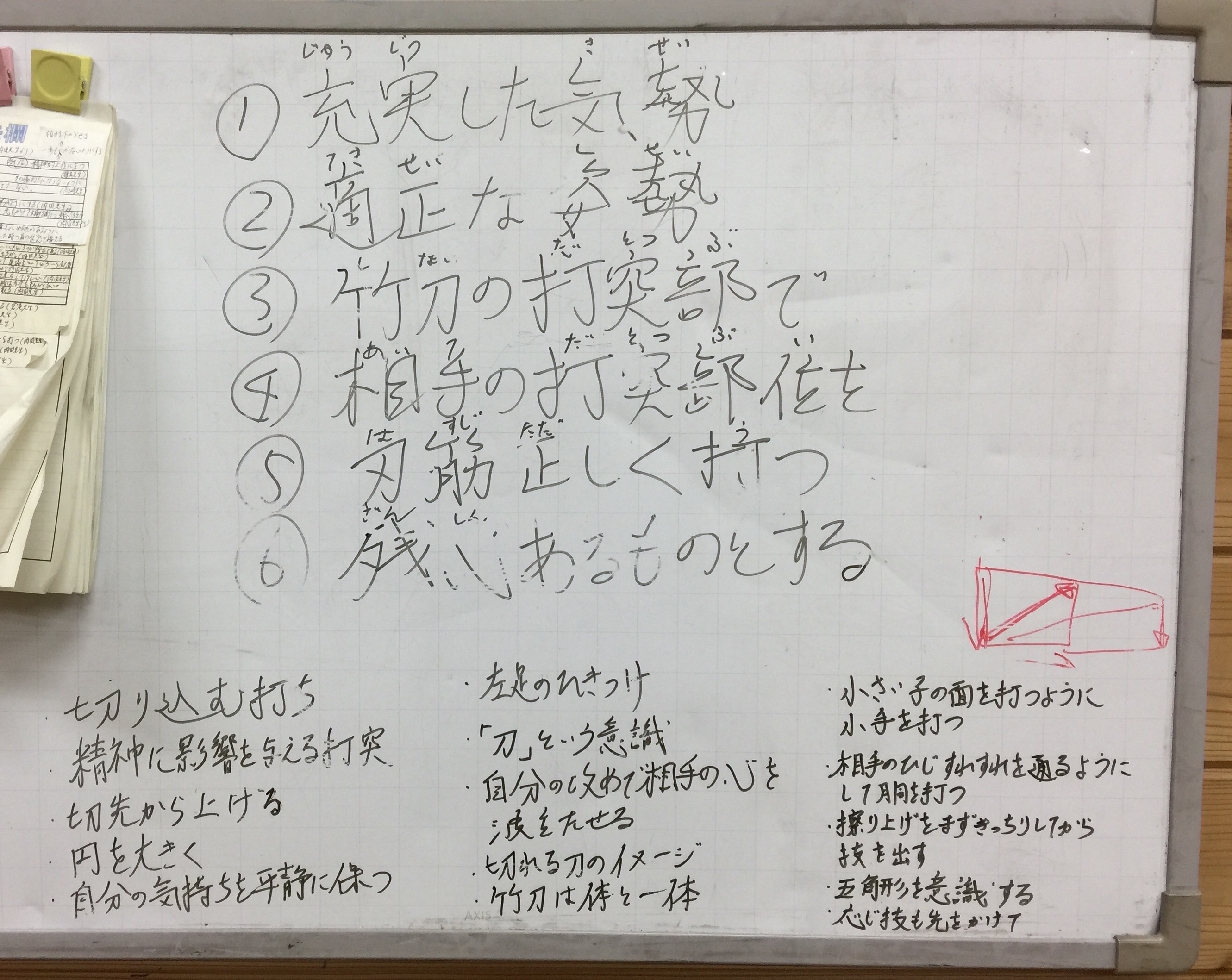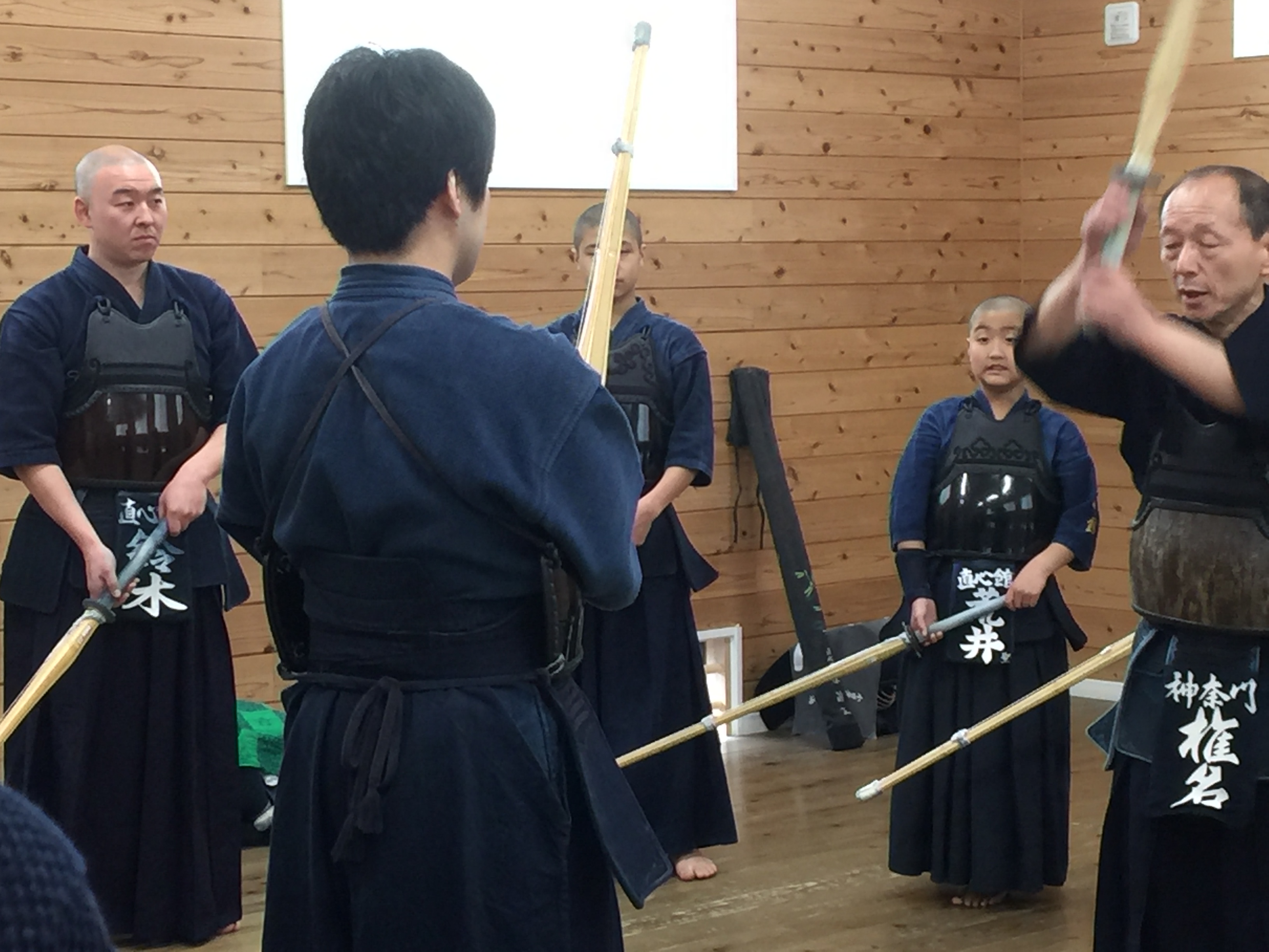 本日は、教士八段の椎名春夫先生を招き、指導稽古をしていただきました。午前10時から始まり、昼食を挟んで午後4時半まで熱心なご指導をいただきました。正しい素振りの仕方、竹刀を刀として扱う意識を持つこと、相手のあごまで切り込む面打ちをすること、左足の引き付け、手の内の作用など、非常に多くの大切なことを教えていただきました。私は特に「相手の心を波立たせる攻めを意識することが大切である」という言葉が心に響きました。「勝ってから打つ」剣道ができるようにこれからも精進していきたいと思います。椎名先生、本日はありがとうございました。