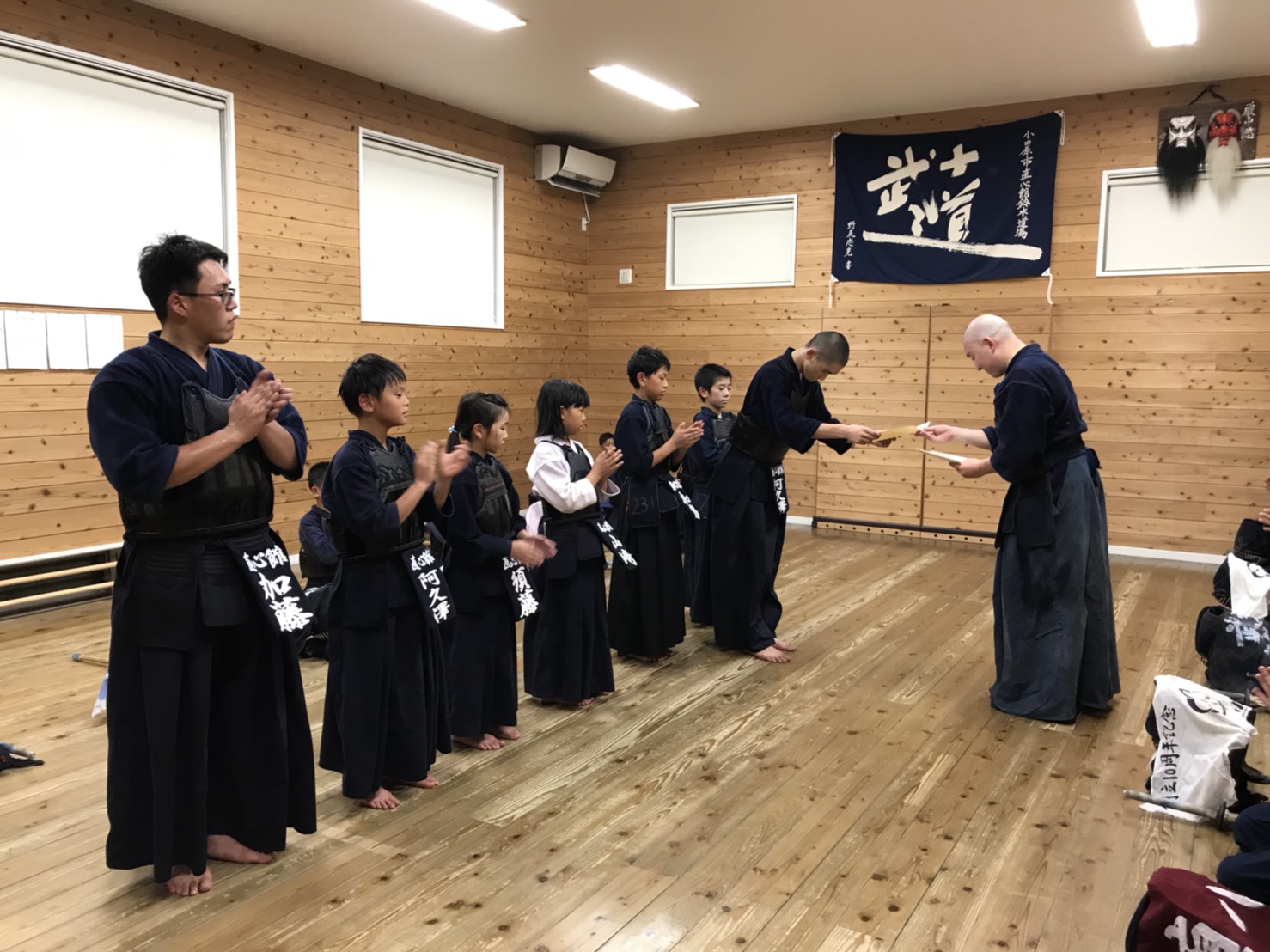 会員の加藤さんが、他地区での昇段審査において二段に合格されました!おめでとうございます(^^)写真は、昇段・昇級の報告と免状の伝達が行われているところです。