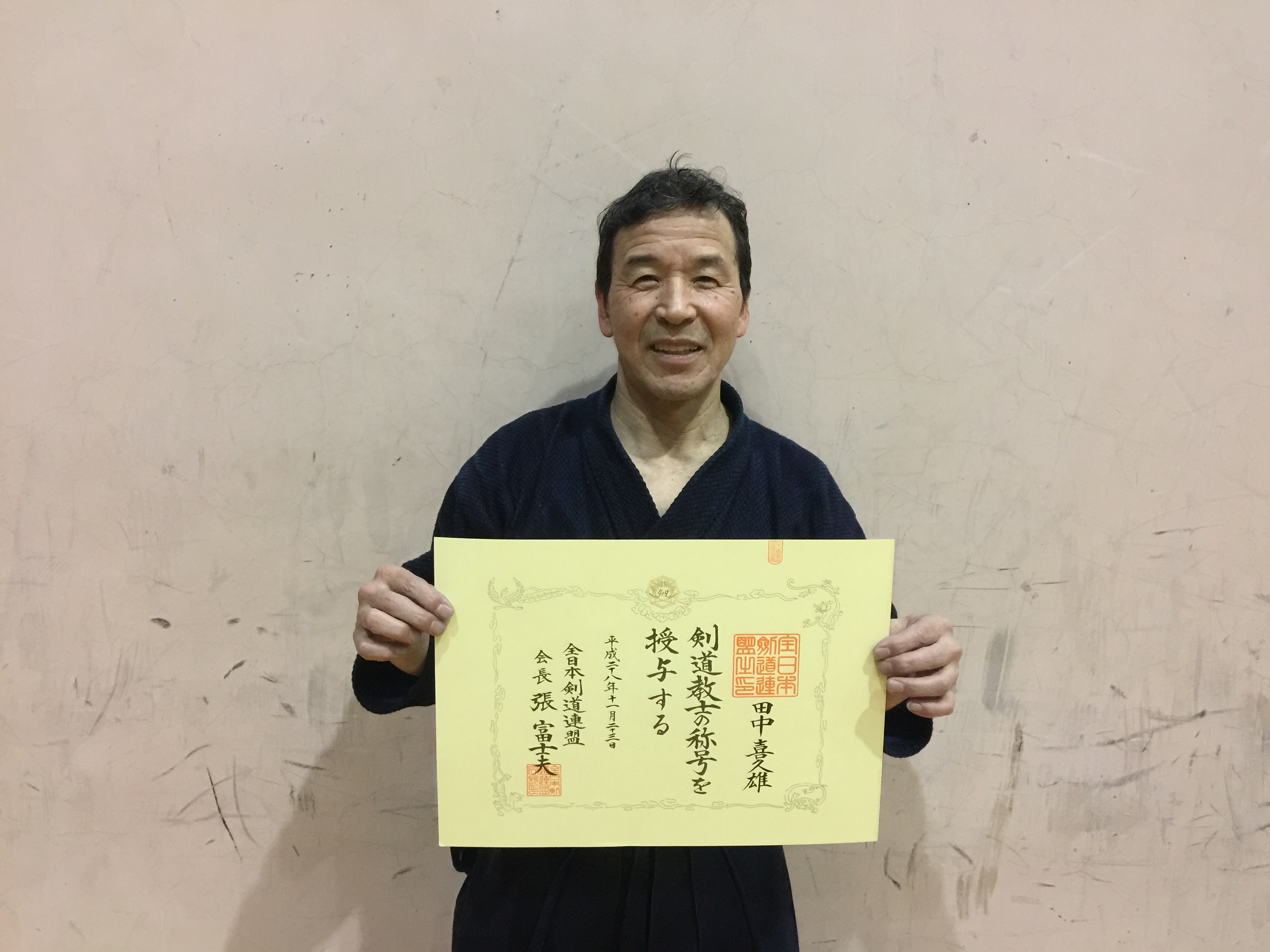 1月28日(土)の小田原剣道連盟合同稽古において、土谷会長より田中師範へ教士号合格の賞状が渡されました。あらためまして、おめでとうございます!!