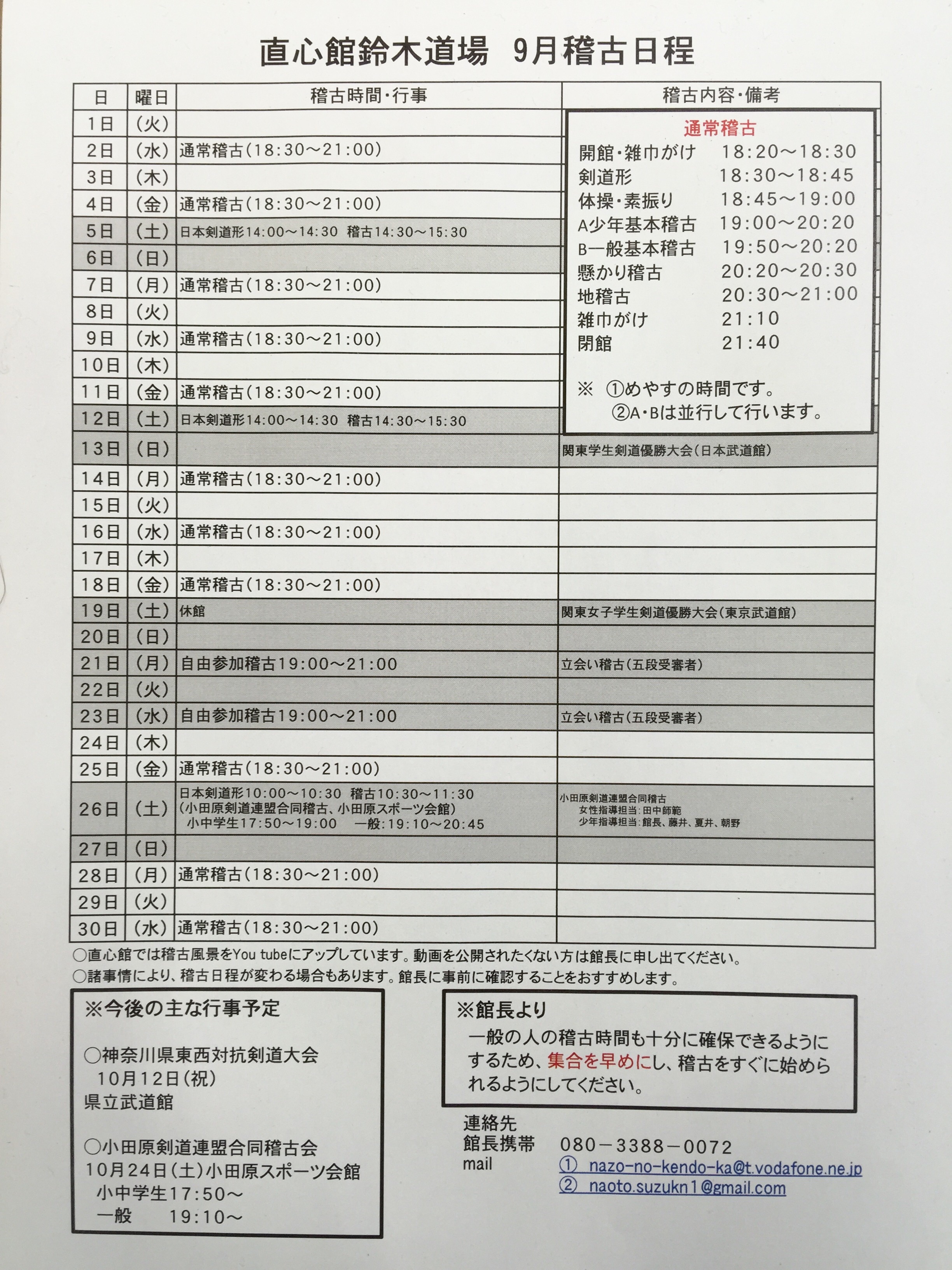 9月の稽古日程をアップします。子ども・大人両方の稽古時間をきちんと確保するため、時間に区切りをつけながら稽古したいと思います。よろしくお願いします。