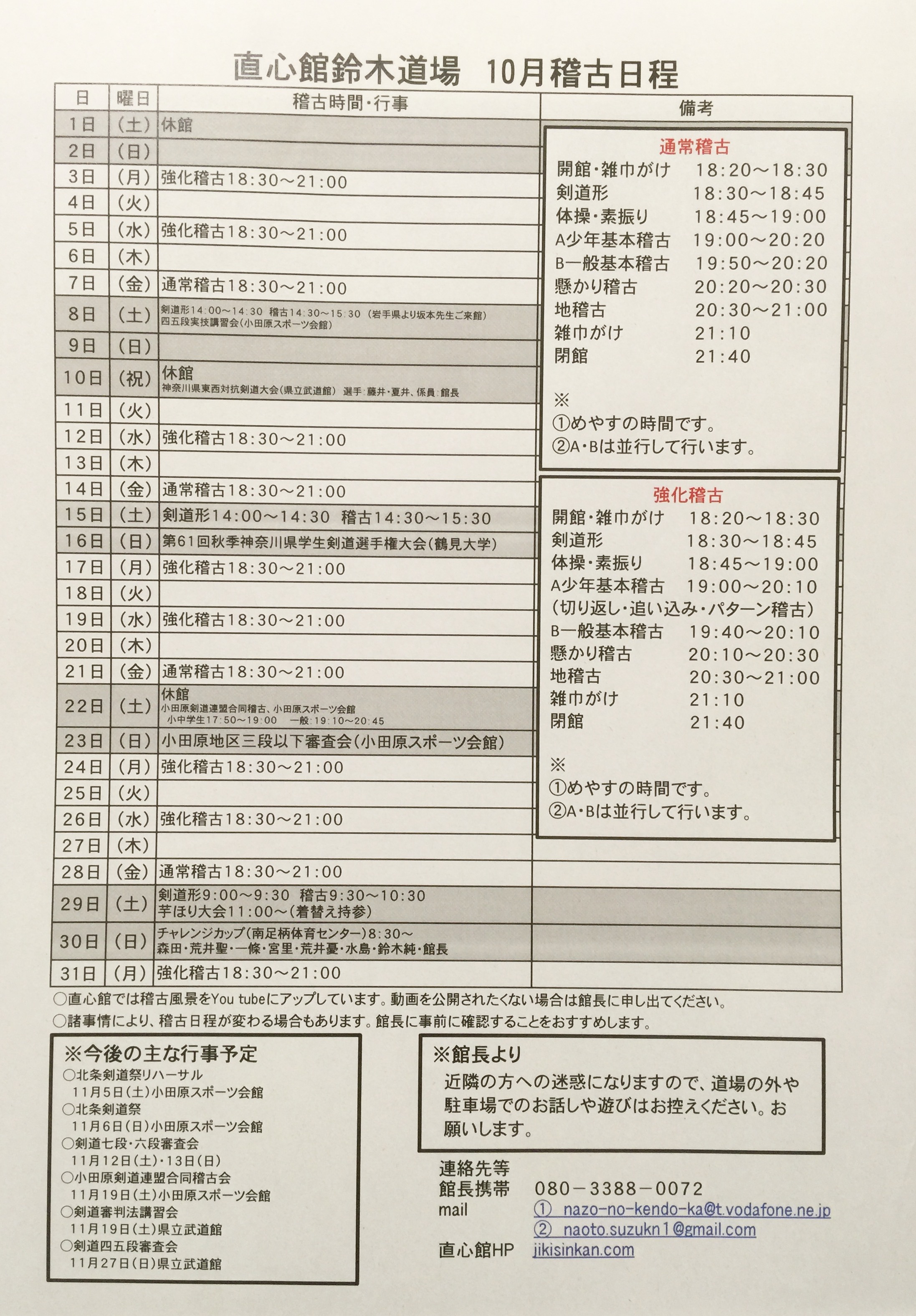 10月の稽古予定です。試合稽古や立ち合い稽古もしていきます。みなさんの参加をお待ちしております!
