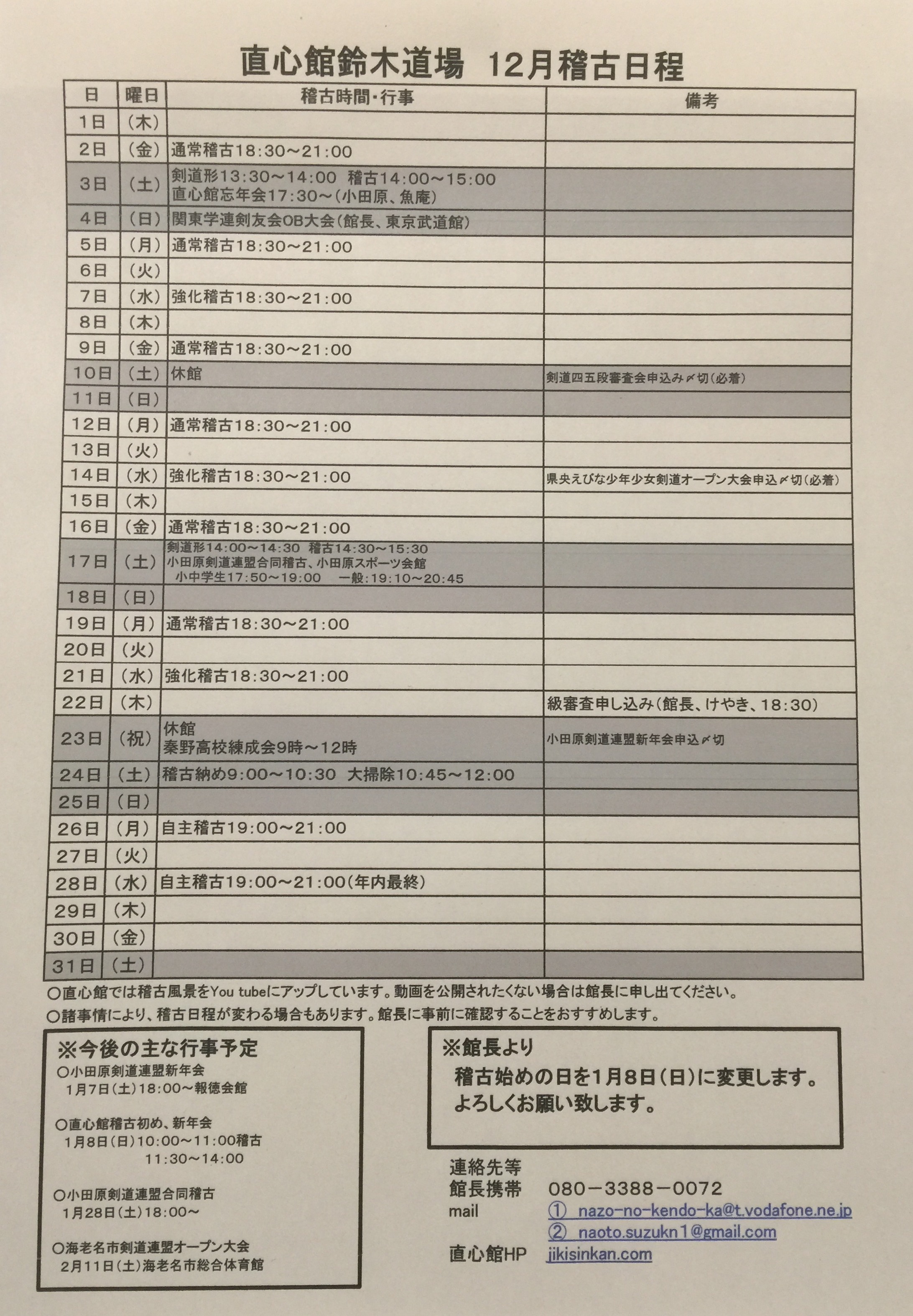 12月の稽古予定をアップします。都合により稽古始めの日にちを変更しています。ご了承ください。
