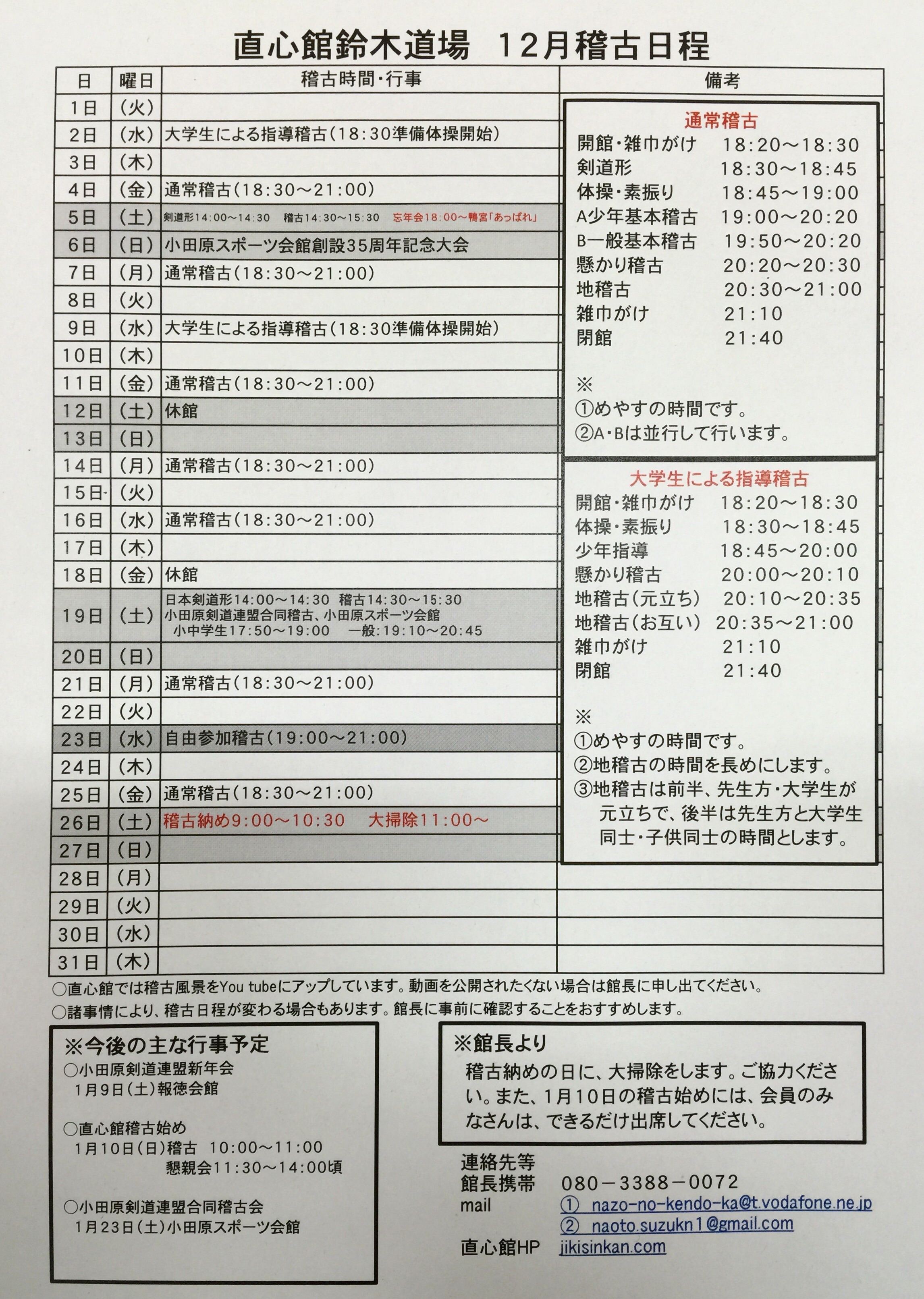 12月の稽古日程 ツイート 12月の稽古日程をアップします。26日は稽古納め、大掃除です。会員の方はできるだけ参加してください。また、1月10日(日)の稽古始めでは、集合写真を撮りますので、こちらもできるだけ参加してください。
