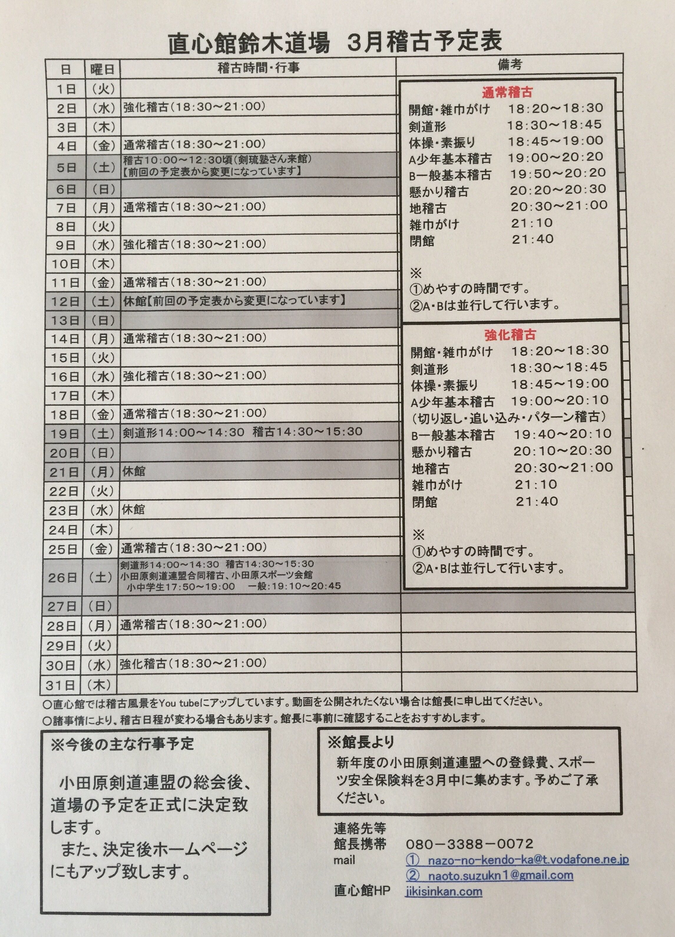 出稽古や館長の仕事の都合により、3月の稽古予定を変更しました。お間違いのないようにお願いします。