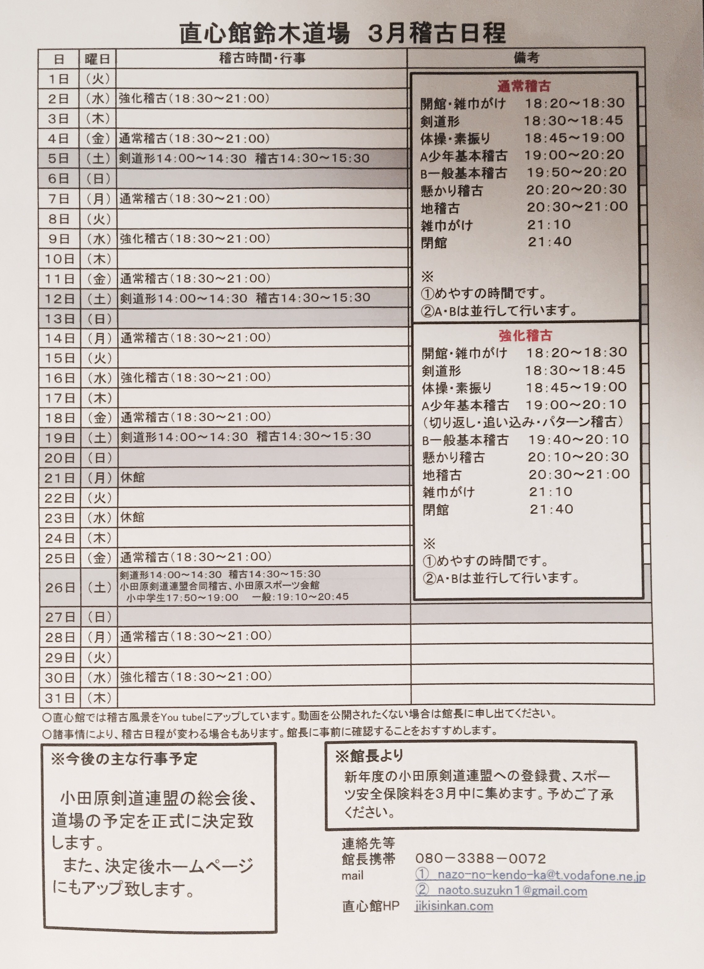 3月の稽古日程をアップします。毎週水曜日を強化稽古の日とします。春の大会や審査に向けて、稽古をしっかり積んでいきましょう!