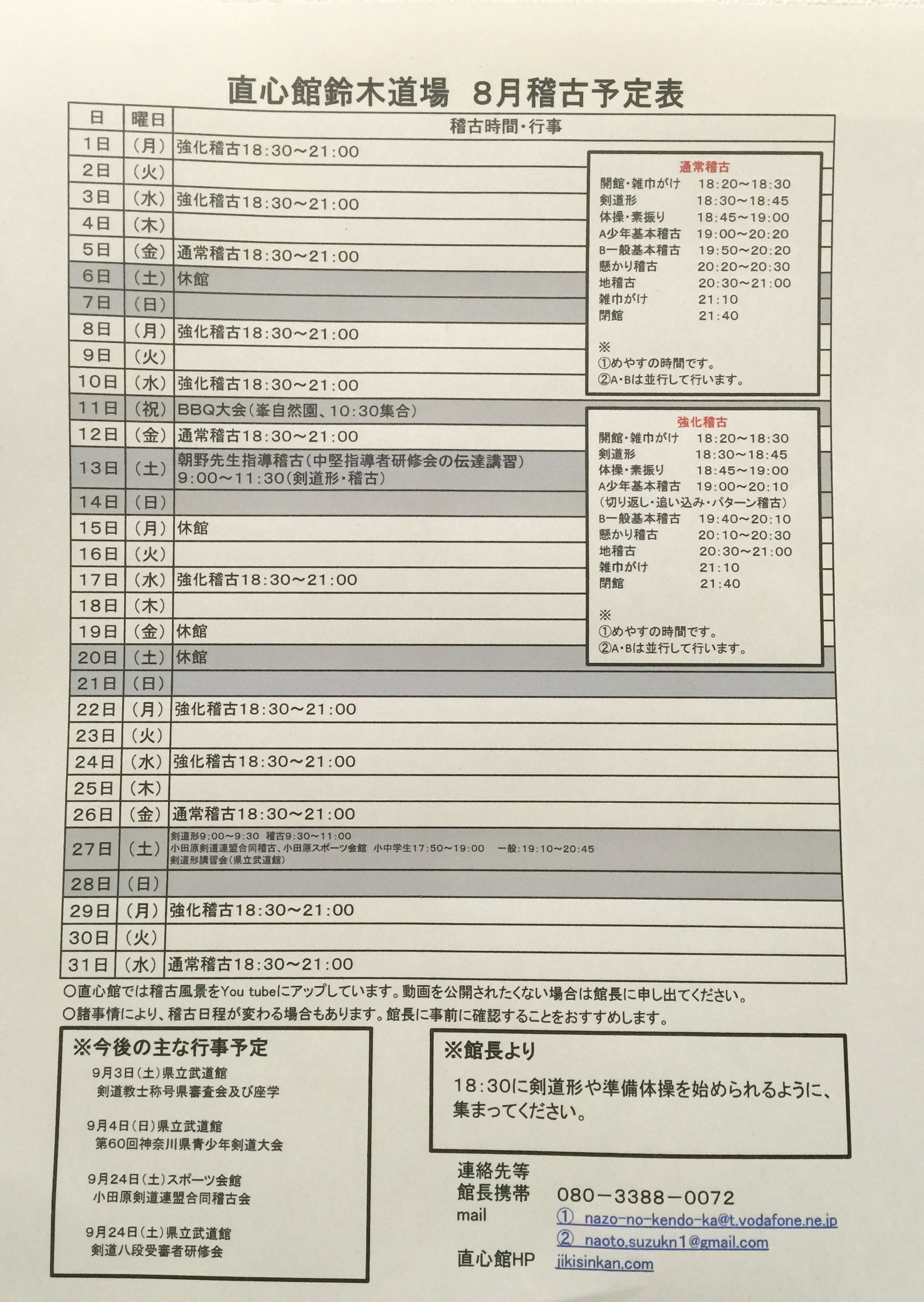 8月の稽古予定をアップします。土曜日の稽古では、一時間前から学習の時間を取ります。課題を持って稽古に来てください。